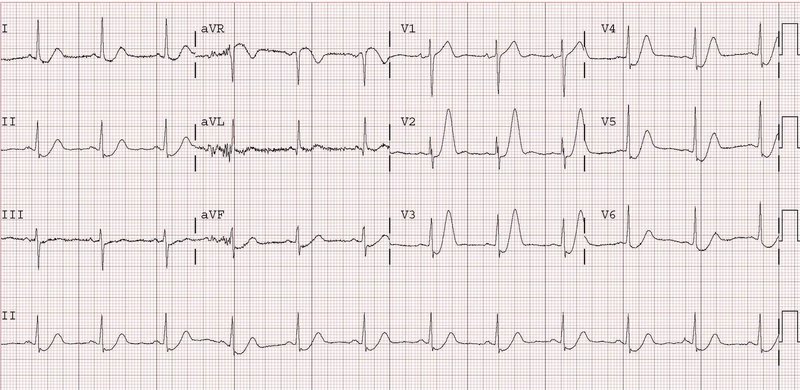 EKG 1: De Winterovy vlny T u pacienta s proximálním uzávěrem RIA