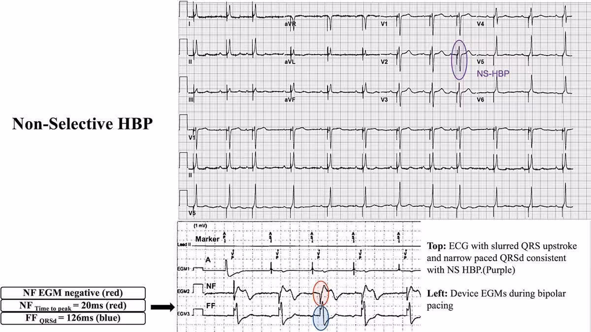 Obr. 2: Příklad Neselektivní hisovské stimulace (NS-HBP) a nález na EGM ze zařízení
