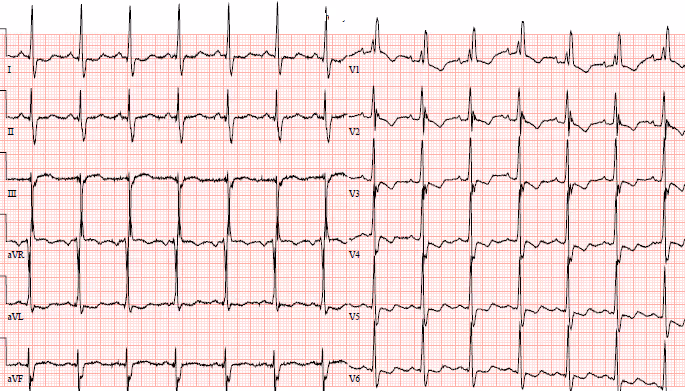 EKG 2: Pozitivní modifikovaná Cornellova kritéria u pacienta s HKMP (hypertrofickou kardiomyopatií) po neúspěšné alkoholové septální ablaci