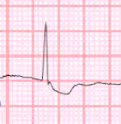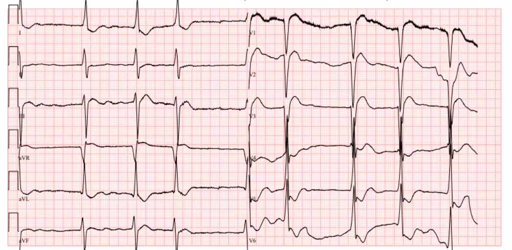 Obr. 1: Typická deprese ST segmentu + bifázické T v důsledku terapie digoxinem