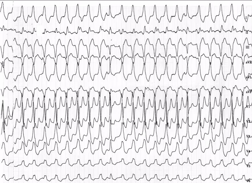 EKG 1: Monomorfní KT u pacienta s ischemickou kardiomyopatií