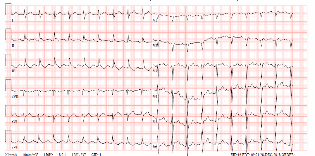 EKG 3: Síňová tachykardie - fokus se nachází anterolaterálně v oblasti anulu trikuspidální chlopně