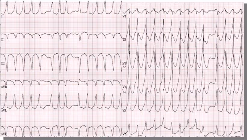 EKG 2: FBI = fast broad irregular tachycardia - rychlá, širokokomplexová nepravidelná tachykardie - fibrilace síní s preexcitací (fibrilace síní v kombinaci s preexcitací komor akcesorní spojkou)