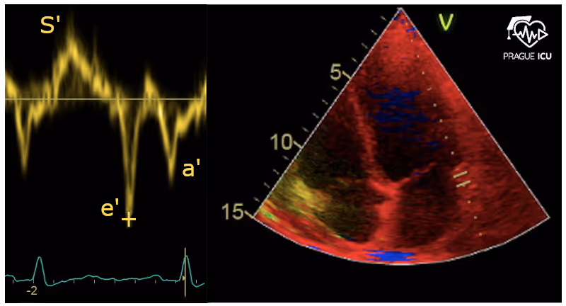 V případě diastolické dysfunkce ve smyslu poruchy relaxace bude e´ spíše nízký. Naopak vlna E se při zvýšených plnících tlacích zvyšuje.