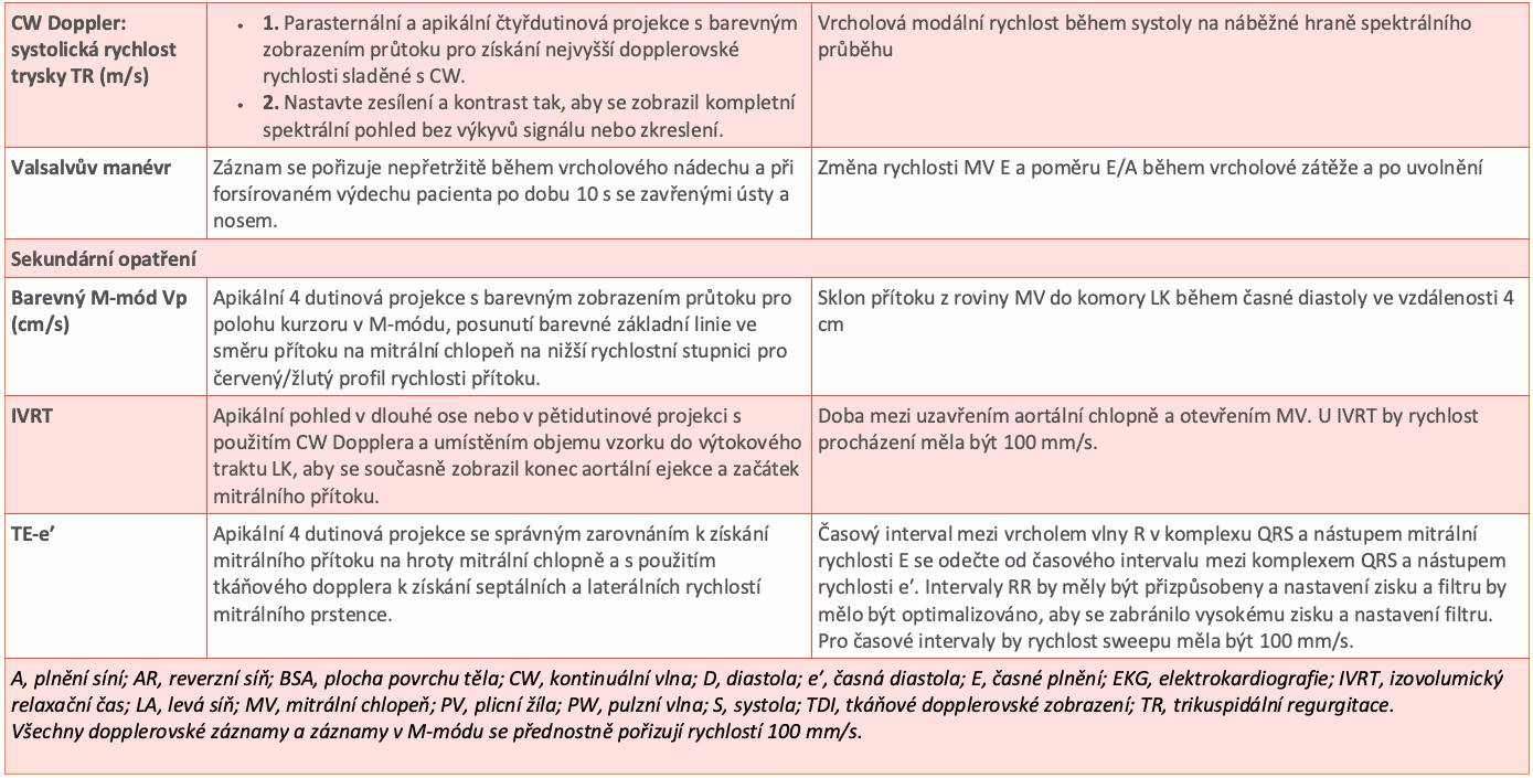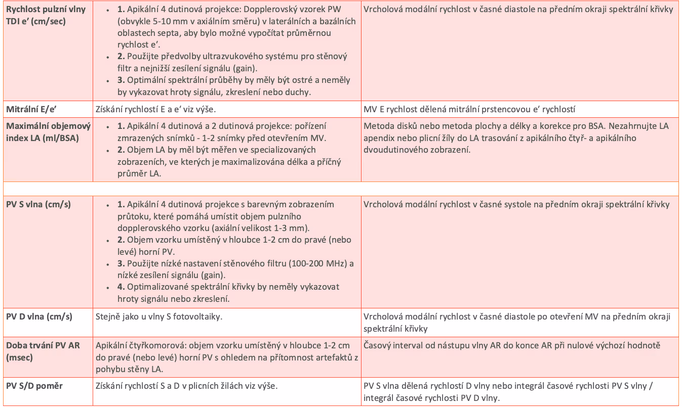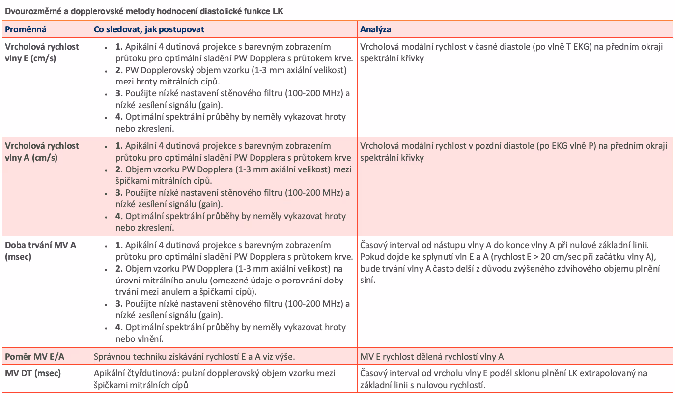 Převzato z: Nagueh SF, Smiseth OA, Appleton CP, Byrd BF 3rd, Dokainish H, Edvardsen T, Flachskampf FA, Gillebert TC, Klein AL, Lancellotti P, Marino P, Oh JK, Popescu BA, Waggoner AD. Recommendations for the Evaluation of Left Ventricular Diastolic Function by Echocardiography: An Update from the American Society of Echocardiography and the European Association of Cardiovascular Imaging. J Am Soc Echocardiogr. 2016 Apr;29(4):277-314. doi: 10.1016/j.echo.2016.01.011. PMID: 27037982