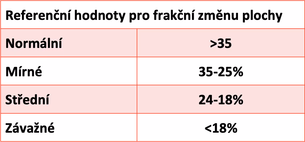 Vzorec: Frakční změna plochy PK = (plocha na konci diastoly - plocha na konci systoly) / plocha na konci diastoly.