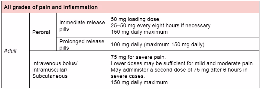 NSAID - Inhibits cyclooxygenase 1 and 2 which results in block of production of prostaglandins, normally involved in the mechanism of inflammation and pain signalling.