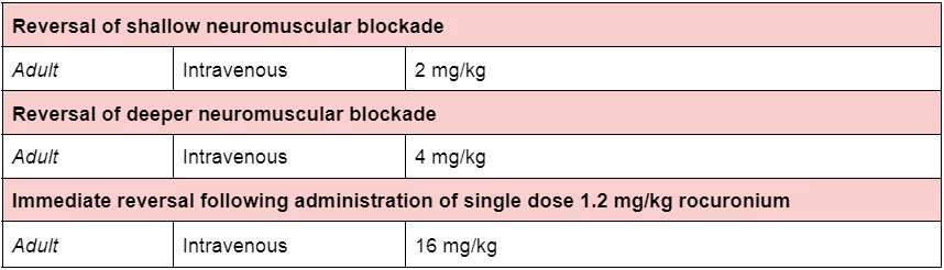 Is used as a selective quick-acting rocuronium and vecuronium antagonist.